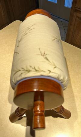Rolling pin shaped stool was fashioned this way to rest weary tired feet without putting pressure directly on one’s heels. Legs rested behind the ankle area while the feet hung over the curve of the rounded cylinder. It is quite comfortable & at a time when gout was a common problem this style of footstool really helped