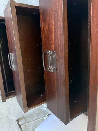 Structurally perfect. Could use some polishing on the top of deskand a wood pen to fill in scratches. 3 separate pieces, super easy to move, is solid and and super nice! All the drawers open and close however, one of the bottom drawers just needs to be adjusted. I believe I’m not gonna take the time to try to fix it though. It is shown in pictures. Pick up is in Kiefer.