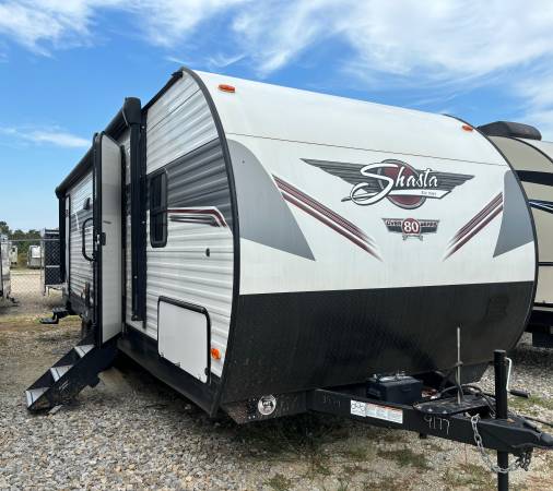 2022 Shasta Travel Trailer bumper pull camper with slideout, model 26DB, weight 5318, length 31’8, heavy duty steps!, 2 door entry, spare tire, rear rack, huge awning!!, inside front Master bed, brand new bedding and pillows, side closets, upper cabinets, under bed storage, doors for privacy, media center for a TV (ask and get one for free new in a box before the camper leave!!), cabinet, sofa that can lay flat for sleeping if needed, booth dinette, full kitchen with black and stainless steel appliance, frig/freezer, microwave, stove, double sink, many cabinets, full bathroom with brand new shower curtain tub/shower combo, sink, medicane cabinet, toilet, wood door, 2 full size plush bunks with brand new sheets and pillows. Gorgeous camper!!! Clean/clear title!!!! Clean and clear title!! This is an incredible buy!!!! NO FEES, NONE!! Why? WE ARE WHOLESALE FOR YOU!!!!! Always selling at wholesale!! We have aprox 45+ campers plus....fifth wheels and travel trailer bumper pulls all selling at true wholesale prices! We rarely ever can be beat and usually by thousands! We have ZERO FEES. We have all campers lined up, prices on the front (you dont pay a penny more/no extra fees at all!), all professionally cleaned and all slides out. We are family owned and operated. We have a website allseasonsrvs.net...... but know we only list about 10 campers...and we usually always have apx 45+ available...please visit to see all inventory. Comes with a demonstration, 2 propane tanks, sewer & water hose, battery & power cord! Call if you want something you dont see at 405 481 1119. We are at All Seasons RVs 11722 N Hwy 99, Seminole, OK 74868. All campers have free/Clear titles on hand. If you need a loan we have bankers we work with in town or we can use your banker. Pls come by as we would love to earn your business. Call for hours. Phone 405 481 1119. Calls are taken during days open only. Pics just taken. Thanks!
