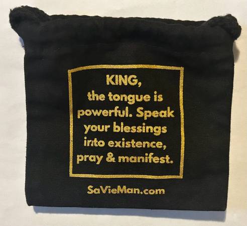 The text on the black drawstring bag says: KING, the tongue is powerful. Speak your blessings into existence, pray & manifest.
